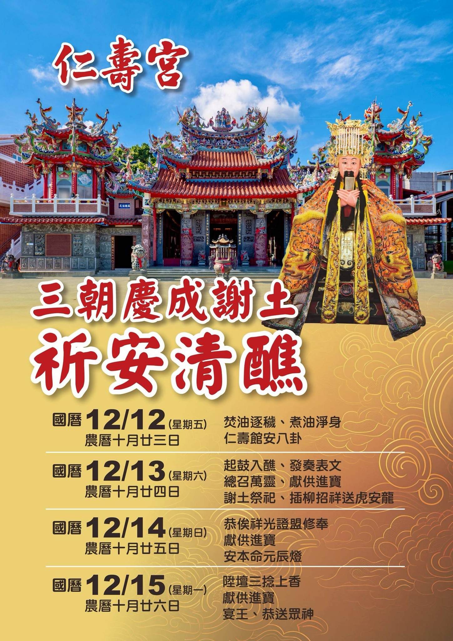 活動花絮 三朝慶成謝土祈安清醮 歡迎總統賴清德蒞臨揭匾 乙巳年三朝慶成謝土祈安清醮 謹訂於 114年12月13.14.15日三天隆重舉行 114歲次乙巳慶祝保生大帝聖誕系列活動 歲次乙巳114年春節文化祭 114年元旦起點燈活動開始受理 月老神君聖誕~拜月老求良緣 113.09.17 榮獲113年全國宗教團體[宗教公益獎] ~9月6日 中元普渡法會(8月19日~農曆7月16日) 6️⃣月🔟日️✨️取午時水慶端午 恭祝保生大帝聖誕祝壽活動113.04.13~04.23 恭祝保生大帝聖誕祝壽活動~捐血活動113.04.23 恭祝保生大帝聖誕祝壽活動~繞境113.04.13 歲次甲辰113年仁壽宮賀歲迎春活動02.10~02.19 台灣燈會仁壽宮燈區啟燈儀式113.02.03 仁壽宮誦經班擴大招生🙏🧧 113年歲次甲辰點燈🏮 月老神君聖誕祝壽活動~邀請鄉親相招來逗熱鬧!! 仁壽宮從未派人以整修寺廟為由,向大家勸募油香金。請大家小心以免受騙。 仁壽宮廟頂剪黏整修暨仁壽館新建工程奠基動土興工典禮 恭祝保生大帝聖誕活動~境內宮廟身尊安座與辭駕112.05.04 #2024南瀛國際民俗藝術節 113年仁壽宮中北部宮廟参訪 8/31仁壽宮中元普渡 癸卯年仁壽宮中元普渡植福法事 仁壽宮廟頂剪黏剪修啓動工程🛠 歸仁國中基測考生仁壽宮祈福參拜112.05.15 恭祝保生大帝聖誕~文創商品112.04.22 恭祝保生大帝聖誕活動~境內宮廟祝壽112.05.04 恭祝保生大帝聖誕活動~頒發境內高中國中小學獎學金112.05.04 恭祝保生大帝聖誕~祝壽表演112.05.04 恭祝保生大帝聖誕活動~祝壽三獻禮大典112.05.03 恭祝保生大帝聖誕活動~ 校閱架棚112.04.29 恭祝保生大帝聖誕祝壽活動~巡守繞境112.04.29 癸卯年仁壽宮慶祝保生大帝聖誕系列活動 🎊恭祝〔癸卯年保生大帝聖誕活動〕預告~ 興建仁壽館多功能活動中心 仁壽宮廟頂剪黏整修工程 抄寫大道真經祈福活動112.04.30星期日上午9時 臺灣保生大帝信仰總會第五屆第四次會員大會 癸卯福兔迎新仁壽宮春節活動 癸卯福兔迎新仁壽宮同樂晚會 仁壽宮春節平安橋安壇 仁壽宮福兔迎春景觀 仁壽宮2023年春節紀念品 仁壽宮自112年國曆1月2日起受理癸卯年點燈作業 台灣保生大帝信仰總會第五屆第三次會員大會 走讀南鯤鯓深度之旅 112年仁壽宮祭典爐主評選 仁壽宫中元普渡植福法事時程表 國曆8/13 農曆7/16 仁壽宮第十四屆管理委員會會議暨就職宣誓 仁壽宫管理委員會選舉 本宮第十四屆管理委員會主任委員.常務監查委員.常務委員.監察委員選舉 新豐高中校長率領學生祈福参拜 恭祝保生大帝聖誕千秋祝壽大典宮廟蒞臨祝壽暨平安宴 恭祝保生大帝聖誕千秋祝壽大典 歲次壬寅保生大帝聖誕千秋 ⚜️ 抄寫大道真經祈福活動 ⚜️111年4月10日(日)上午9時[農曆3月10日] 巡狩遶境 宮廟陣頭精彩花絮 仁壽宮 巡狩繞境 恭迎仁壽宮神尊神轎安座 4/09 巡狩遶境路線時間圖 活動預告~歲次壬寅恭祝保生大帝聖誕千秋抄經祈福活動 活動預告~歲次壬寅保生大帝聖誕千秋遶境日期農曆3月9日(六) 大年初九 恭祝玉皇上帝萬壽無疆 大年初五仁壽宫跋桮比赛與頒獎 大年初四飛揚民族舞蹈 大年初三奇幻馬戲團 🎏初二福氣臨門回娘家 廟口走春仁壽宮 #大年初一廟口走春 #仁壽宮春節花絮(二) 大年初一廟口走春 仁壽宮春節花絮(一) 消災解厄七星平安橋躜轎腳 仁寅虎年~春節廟口行春仁壽宮活動 仁壽宮壬寅年春節活動 [1] ~藝文饗宴同樂晚會 迎新111壬寅虎年春節文化季活動即將開場 敬邀鄉親來仁壽宮祈福走春 新豐高中校長楊榮仁帶領學測考生祈福 2021歸仁耶誕同樂會歲末親子活動~記者會 友宮交流~淡水正興宮蒞臨參香 歸仁美食二部曲~外國人騎Be-bike遊歸仁吃美食活動 新北市蘆洲保和宮蒞臨參訪 台灣保生大帝信仰總會第五屆第二次會員大會~台中市沙鹿慶安宮 友宮交流~本宮至雲林縣古坑南昌宮訪宮 捐贈建廟經費 南投縣政府文化局(縣史館)文化資產志工參訪 本宮獲頒市府宗教團體社會公益善舉表揚 111年各祭典爐主 擲筊評選出爐 廟埕音樂會 中壇元帥.斗姥元君聖誕千秋祝壽團拜 東奧桌球選手鄭怡静前往仁壽宫感謝東奧賽事期間保生大帝及衆神加持 110年 宗教團體表揚大會 仁壽宮乙未年王醮巡禮 捐贈台南市政府消防局救災裝備儀式 南關線三大廟王醮暨遊社登錄重要民俗授證儀式 民國110年4月17日保生大帝聖誕遶境 民國110年玉皇上帝聖誕 民國110年過年初一至初五的活動花絮 宗教場所微解封 歸仁仁壽宮開放參拜搶頭香 2021 仁壽宮 牛轉乾坤(金牛) 特色介紹